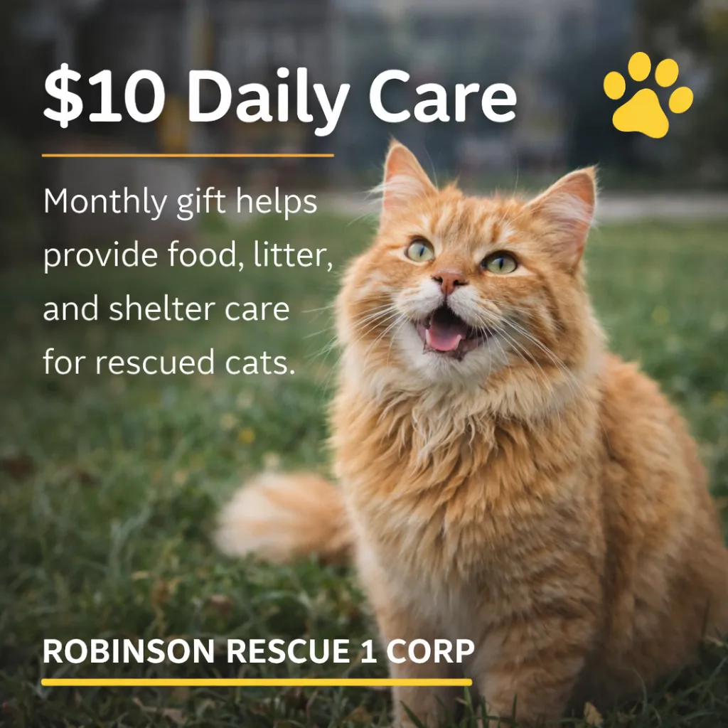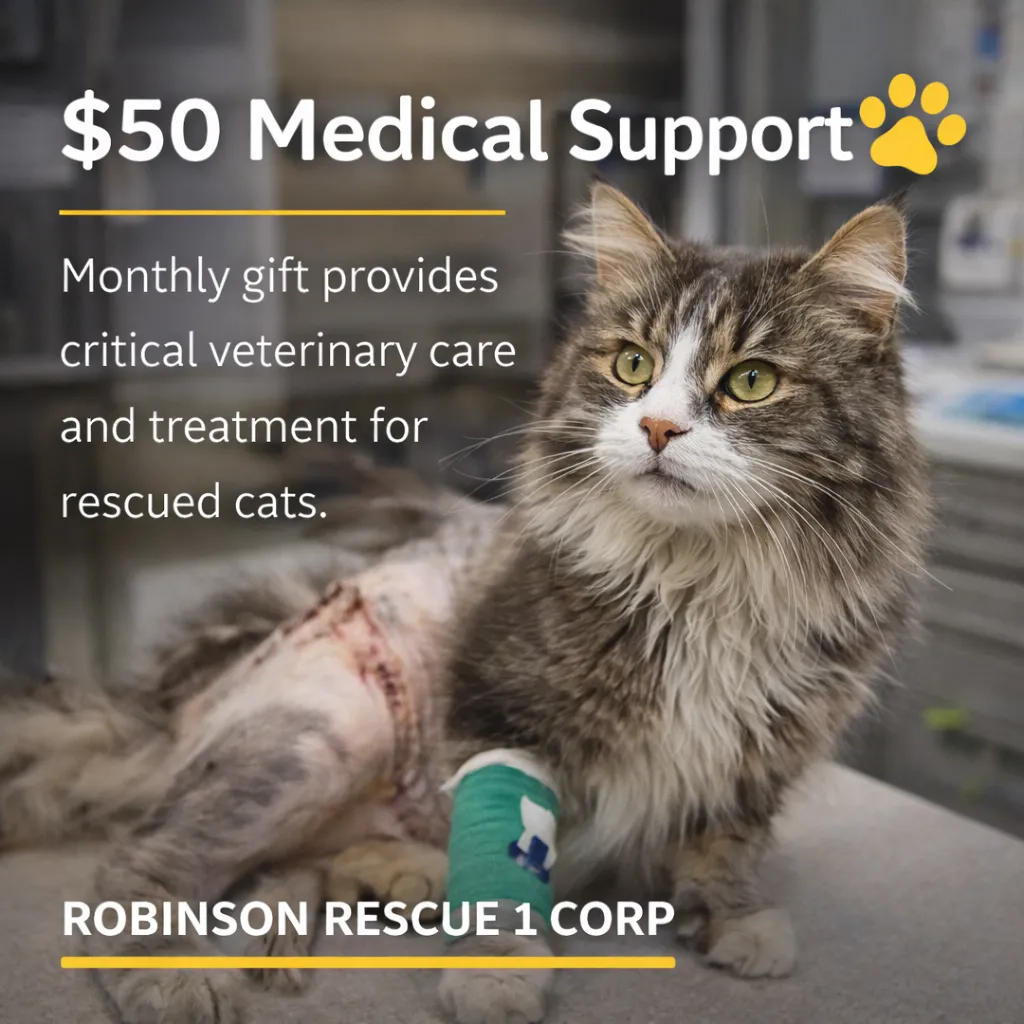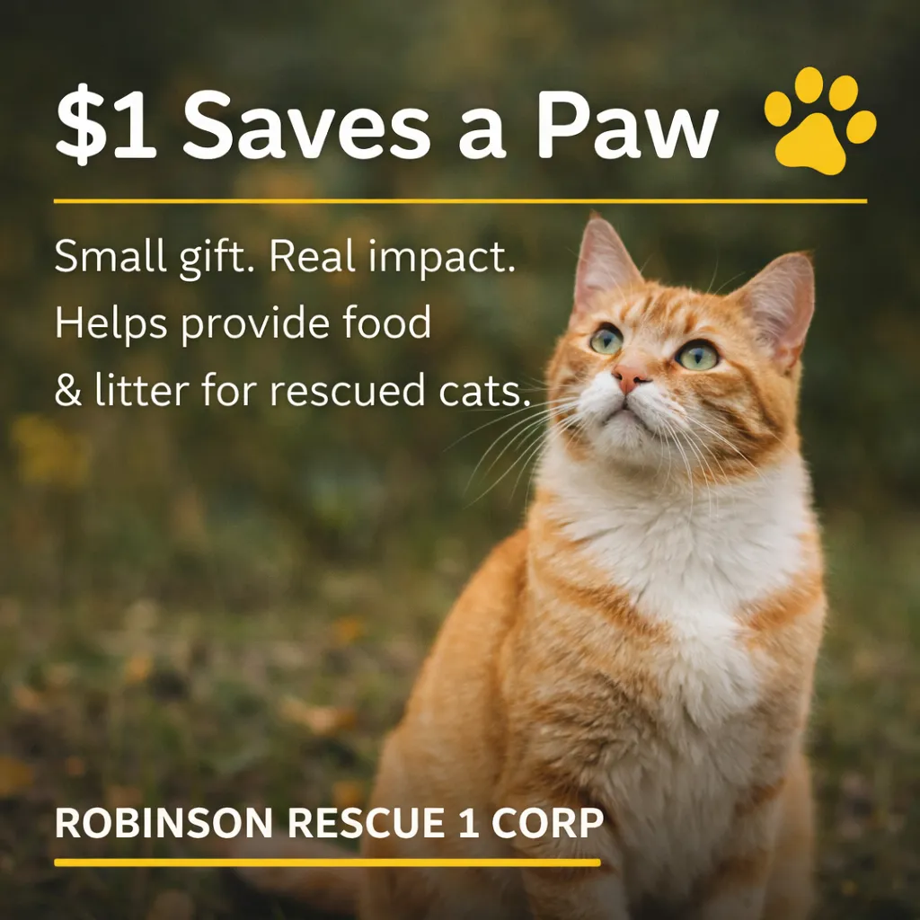 Supporting Robinson Rescue 1 Corp means providing safe shelter, food, medical care, and long-term protection for rescued cats and animals in need. Your donation directly helps build and maintain a secure, climate-controlled rescue space so every animal has a warm, safe place to call home.